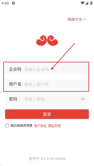 2、在巡店助手登录页面,依次填写企业码和用户名对应的内容。