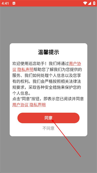 1、在温馨提示弹窗中,阅读用户协议和隐私声明后点击同意。