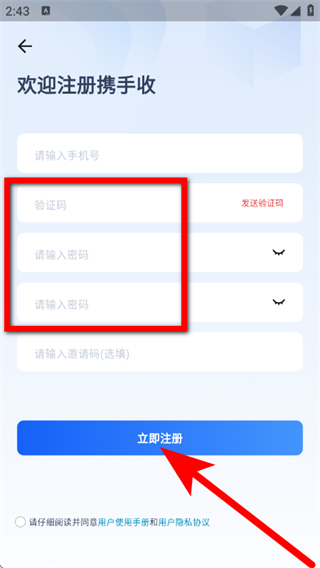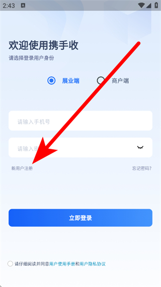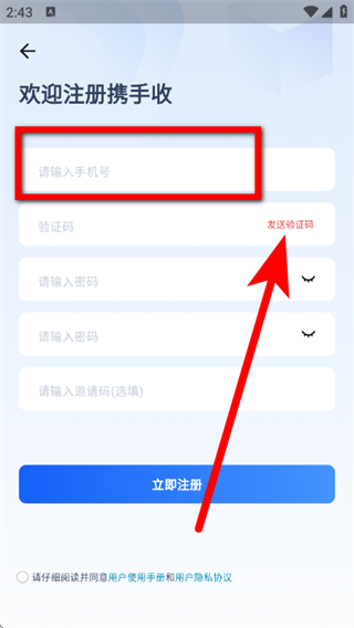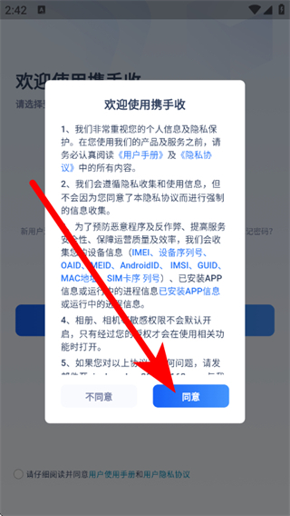 1、在携手收,在提示弹窗,点击同意,进入登录页面。