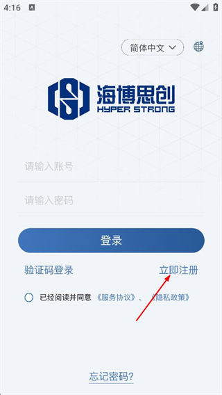 1、在登录的页面,阅读协议后,点击立即注册按钮,进入注册界面。