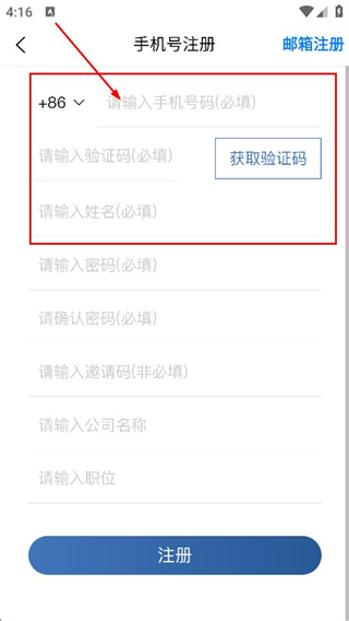 4、在手机号注册页面,填写公司名称、请输入职位后,点击注册的按钮完成注册操作。