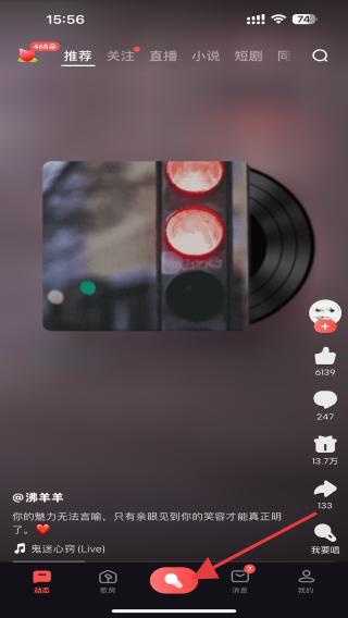 1、进入主界面后,点击底部正中间的红色话筒图标点歌的按钮。