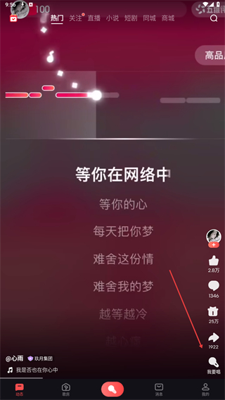 1、启动全民k歌App,在视频右下方点击我要唱的按钮。