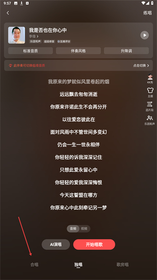 2、进入歌曲预备演唱页面内,点击左下方合唱的按钮。