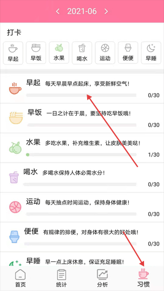 4、在习惯页面,通过早起吃饭等打卡功能养成健康作息,辅助更规律的周期管理,间接提升周期计算的准确性。