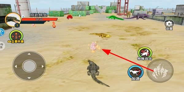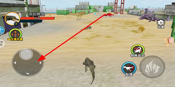 1、操控移动按钮控制鳄鱼在场景内移动,调整位置靠近目标,以便后续进行觅食或攻击等操作,探索场景内的区域。