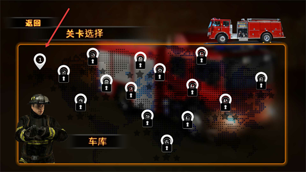 1、进入关卡选择界面后,点击已解锁的1号关卡,即可开启首次消防救援任务。