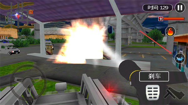 4、到达火灾现场后,点击右侧的喷水按钮,对准火焰区域进行喷水操作,即可完成本次消防救援任务。