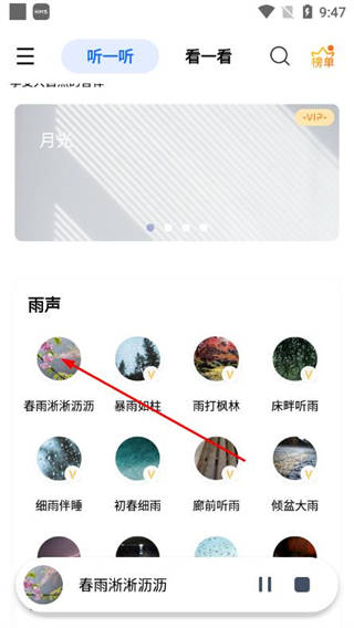 1、打开白噪音APP,在听一听页面选择目标音效,点击进入音效播放界面。