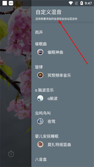 不同音效自由组合搭配,同时将三种不同自然声音融合播放,创造个性化的放松白噪音;