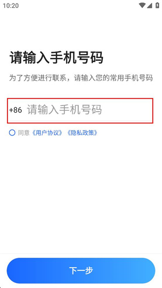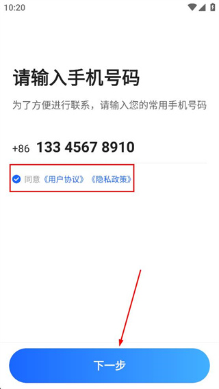 3、确认手机号码填写正确且协议已勾选后,点击界面底部的下一步按钮继续流程。