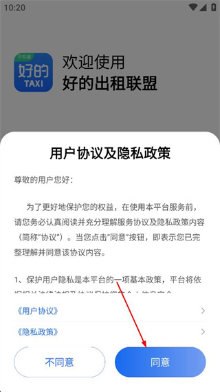 1、查看弹出的用户协议及隐私政策内容,点击界面中的同意按钮,进入手机号输入页面。