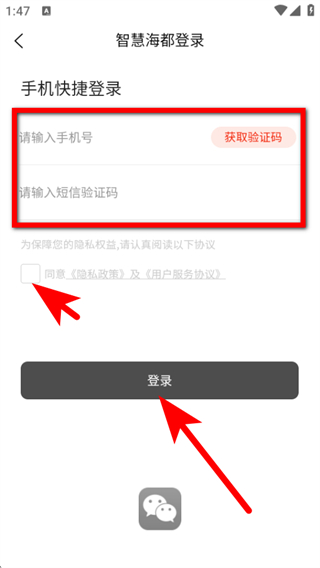 3、在登录页面,输入手机号和验证码,勾选同意协议后点击登录按钮即可。