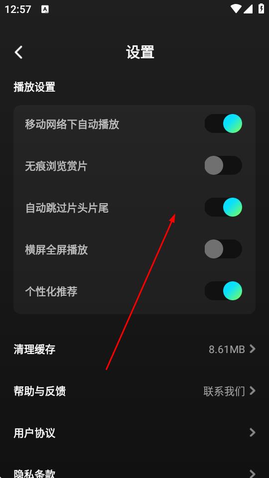 3、进入设置页面后,找到自动跳过片头片尾选项,并点击开启该功能,开启后按钮会呈现亮色。