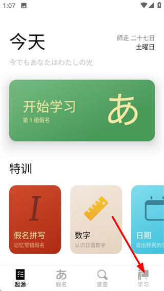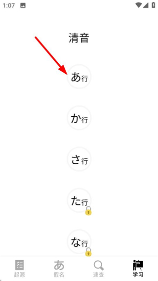 1、进入50音起源后,点击目标假名行选项,可进入对应假名行的学习页面。