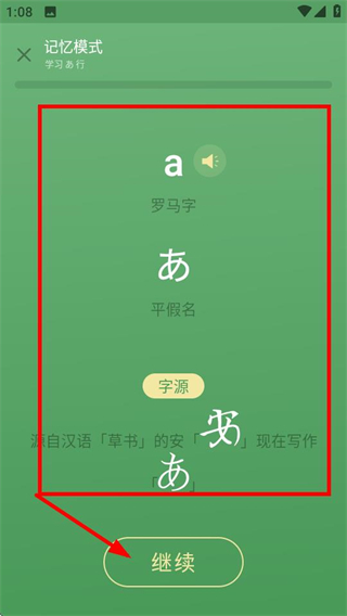 3、查看完当前假名信息后,点击继续按钮,即可进入下一个假名的学习内容。