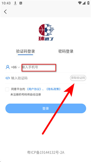 3、在登录界面,在手机号栏填写对应的手机号码,点击获取验证码。