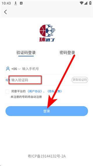 4、将收到的短信验证码填入验证码栏,勾选相关协议后,点击登录完成账号登录。