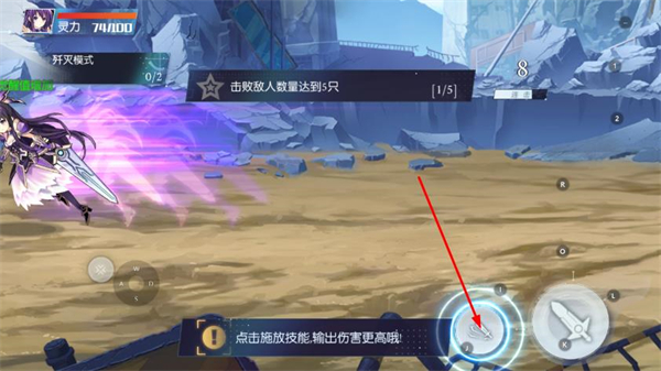 2、待灵力值足够后,点击右侧技能施放技能,能打出更高伤害,加快推进击败敌人数量的关卡目标。