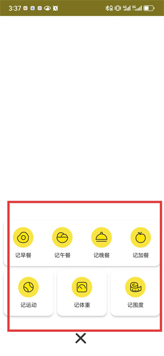 3、点击底部+,可选择记早餐、记运动、记体重等功能,记录饮食、运动、体重等信息辅助减肥管理。