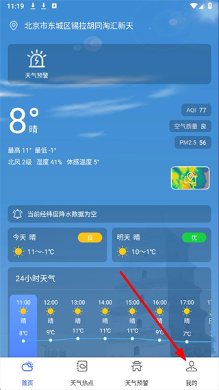 1、进入陕西气象app后,点击首页底部我的选项,进入我的个人页面。
