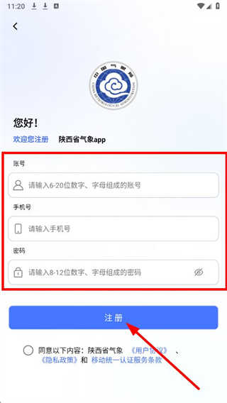 3、进入注册页面,依次填写账号、手机号、密码,勾选同意协议后,点击注册即可完成。