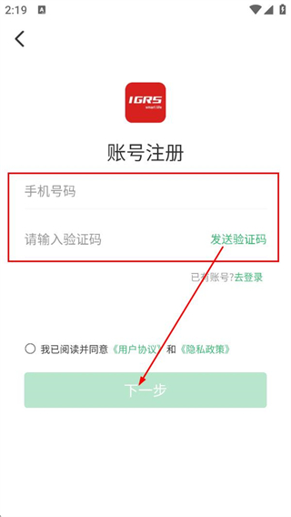 3、在账号注册页,填写手机号码、验证码后,点击下一步完成注册操作。