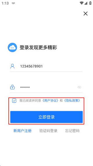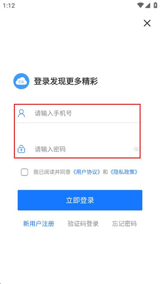 3、在登录界面,输入手机号和密码,勾选协议同意项。