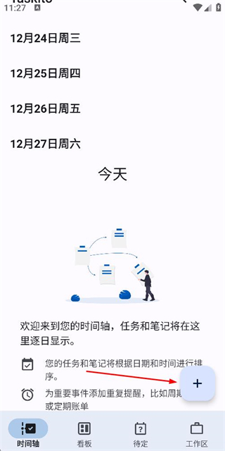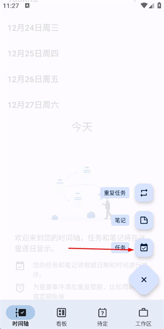 1、在时间轴页面点击右下角的加号按钮,展开操作选项。