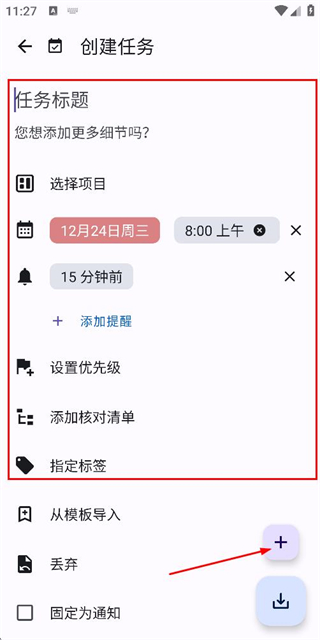 3、在创建任务页面填写信息后,点击页面的加号按钮完成任务创建。