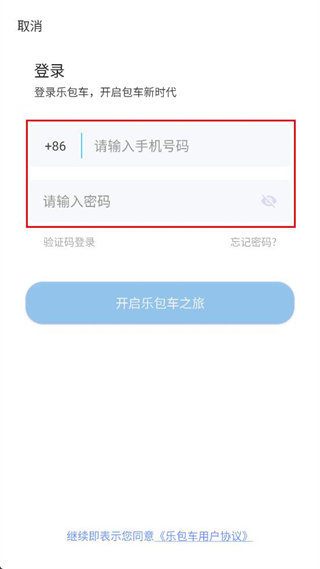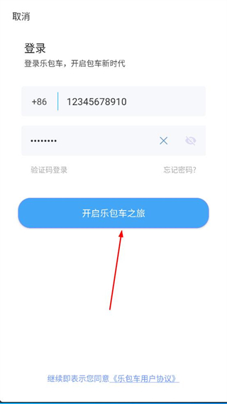 4、确认手机号码和密码已正确输入后,点击开启乐包车之旅按钮完成登录。