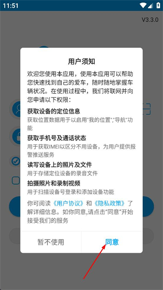 1、查看弹出的用户须知内容,了解所需权限后点击界面中的同意按钮,进入登录页面。