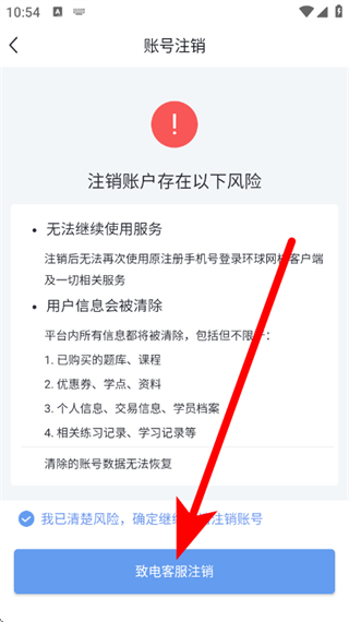 5、在注销账号页面,勾选后,点击致电客服注销,联系客服完成账号注销。
