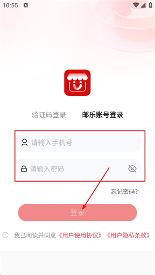 3、切换至邮乐账号登录界面,填手机号和密码后,点击登录,完成登录操作。