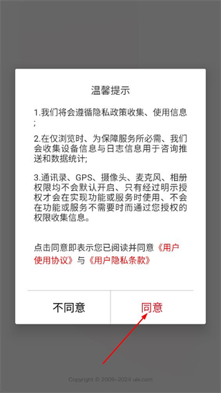 1、阅读用户使用协议和用户隐私条款后,点击同意按钮。
