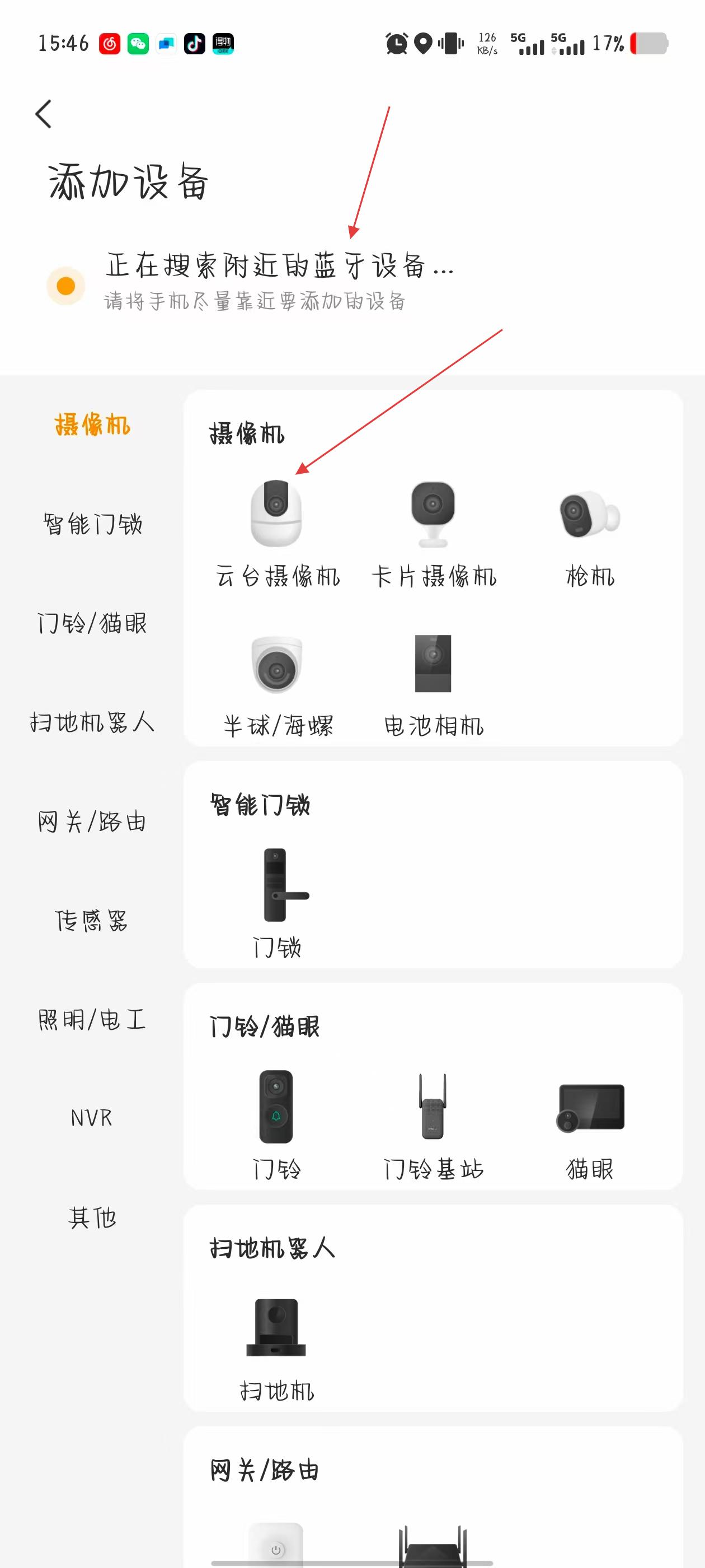 3、在手动添加页面,选择要添加的设备类型,或者等待上方蓝牙搜索设备。