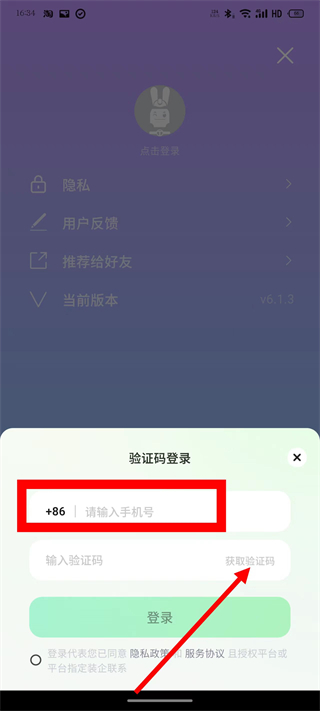 4、在输入框,输入验证码,勾选相关协议后,点击登录,完成登录。