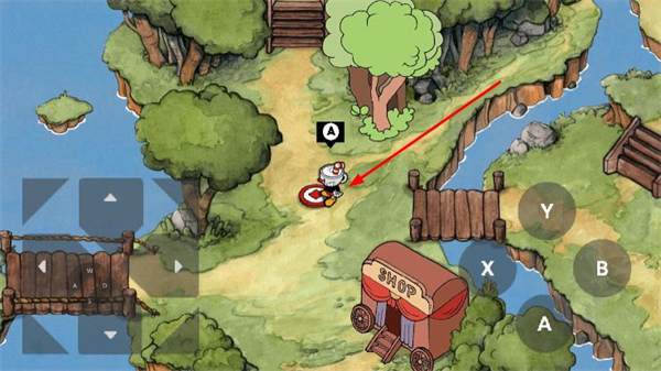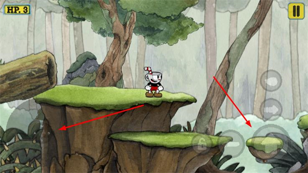 2、通过左侧虚拟摇杆控制茶杯人移动,右侧按键控制跳跃,在平台间移动探索场景。