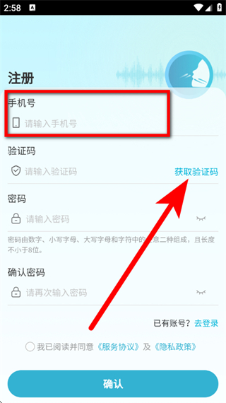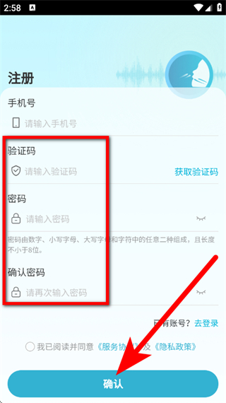 4、输入验证码,设置密码,勾选相关协议后,点击确认,完成注册。