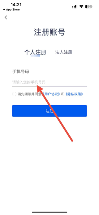 4、进入注册账号页面,先在输入框填写手机号码,同意协议,最后点击注册按钮,即可完成注册操作。