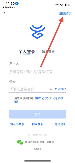 3、在个人登录页面,点击右上角的注册账号选项,进入注册流程。