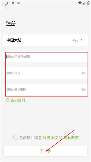3、填写手机号/邮箱、密码、确认密码后,点击下一步,完成操作。