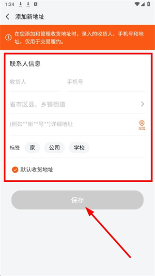 4、在添加新地址页面,填写详细地址信息,选标签后点击保存完成地址添加。