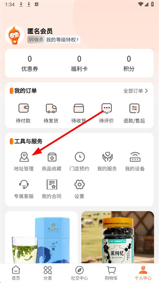 2、在个人中心页面中,找到地址管理选项并点击,进入地址管理页面。