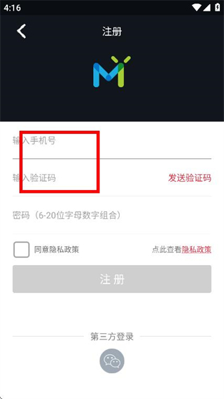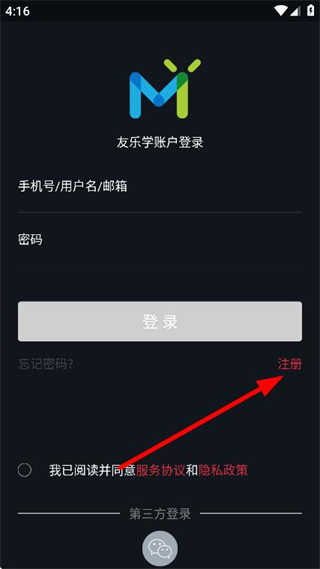 1、打开友鼓助手App,在登录页面点击注册选项。