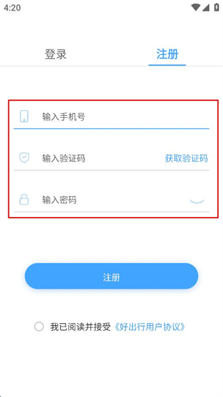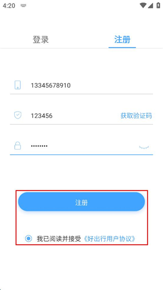 3、勾选我已阅读并接受好出行用户协议的选项,点击注册按钮完成注册操作。