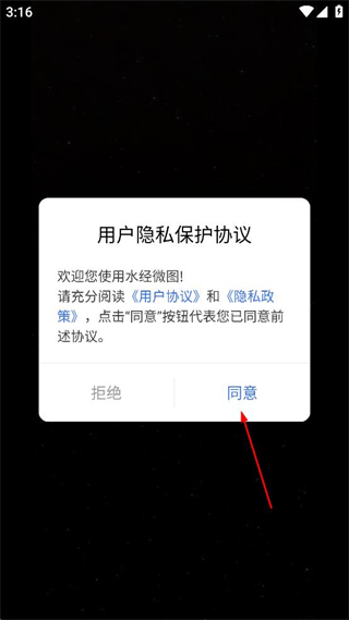 1、打开水经微图软件,出现用户隐私保护协议弹窗,点击同意按钮进入主界面。
