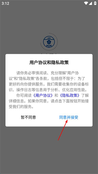 1、打开出行服务软件,出现用户协议和隐私政策弹窗,点击同意并接受按钮。