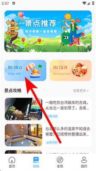 2、在攻略页面,点击热门景点板块,进入热门景点列表页面。