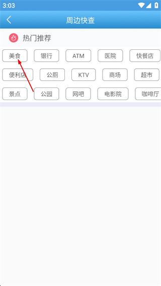 3、在周边快查页面的热门推荐板块里,选择美食选项,即可查看周边美食相关内容。